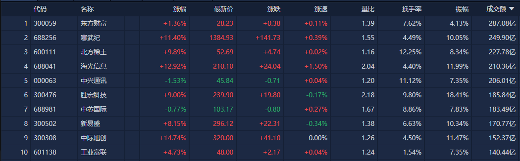东方财富成交额居首,为287.08亿元。其后是寒武纪-U、北方稀土、海光信息、中兴通讯,成交额分别为249.9亿元、227.78亿元、210.36亿元、206.01亿元。